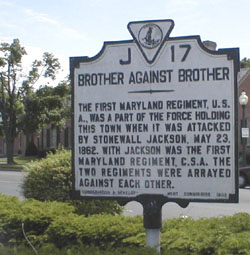 Of special interest to Marylanders is the unique feature of this battle that pitted the 1st Maryland CSA against the 1st Maryland Regiment of the Federal army. In the course of the battle, Captain William Goldsborough of the CSA captured and took prisoner his own brother Charles Goldsborough. Another Goldsborough, who chronicled the history of Marylanders in the CSA wrote that “nearly all recognized old friends and acquaintances, whom they greeted cordially, and divided with them the rations which had just changed hands.” <Goldsborough, J. J., The Maryland Line in the Confederate Army, p. 58.>