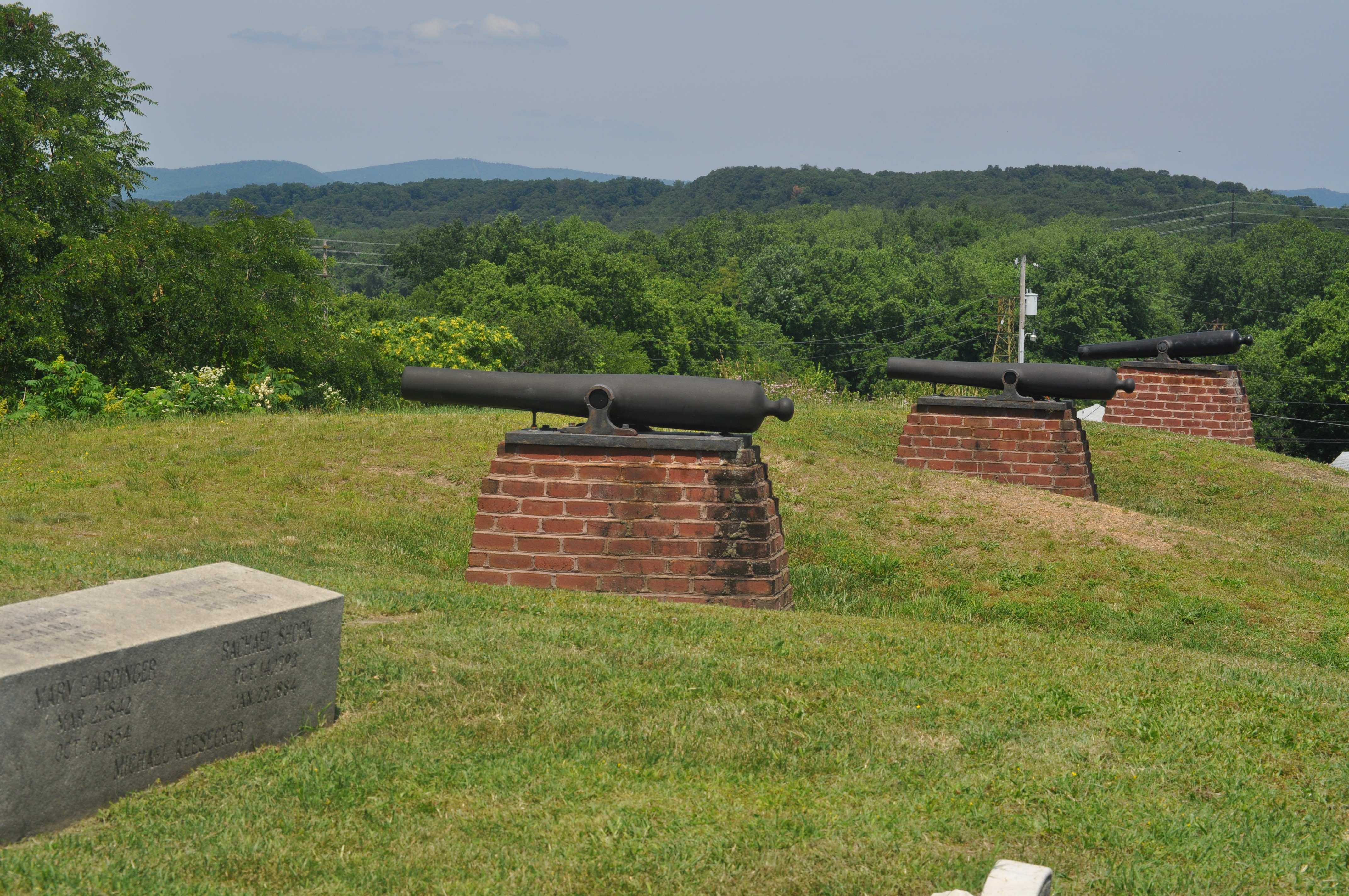 A few hundred yards downriver from the Cushwa Basin is a hill—the highest point in Williamsport.  On this hill, Abner Doubleday placed his battery in a commanding position of the river ford and the Virginia side of the Potomac.  (The old town cemetery has grown at this location, but the earthen parapets for the battery may be seen to this day. A sign marks the location.)