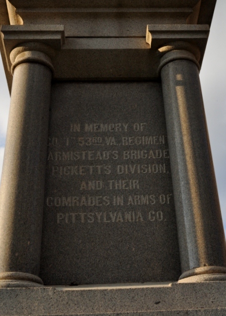 In the center of town is a monument (see pictures below) to the 53rd Virginia regiment – composed of men from this county of Pittsylvania. The 53d Virginia was the middle of five regiments in Armistead’s Brigade in the middle of Pickett’s Charge upon the Federal position at Gettysburg. Of course, this fatal attack was made on this date 149 years ago today. (I’m sure I’ll have more to say about this a year from today!)