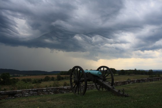 We have had some rather violent storms through the area recently. A couple from New Hampshire was in town the evening before taking a battlefield tour. They drove around a bit and took this very impressive picture of the sky on the south end of the field.