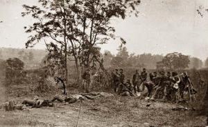 Let us first turn off to the left of the Hagerstown Turnpike; but we must ride very slowly and carefully, for lying all through this cornfield are the victims of the hardest contest of our division <speaking of Doubleday’s Division of Hookers 1st Army Corps>. Can it be that these are the bodies of our late antagonists? Their faces are so absolutely black that I said to myself at first, this must have been a negro regiment. Their eyes are protruding from the sockets; their heads, hands, and limbs are swollen to twice their natural size. Ah! there is little left to awaken our sympathy, for all those vestiges of our common humanity which touch the sympathetic chord are now quite blotted out. These defaced and broken caskets, emptied of all that made them manlike, human, are repulsive merely. Naught remains but to lay them away quietly, where what is now repulsive shall be resolved into its original elements, shall be for a time “Brother to the insensate clod Which the rude swain turns with his share, And treads upon,” and shall reappear in new forms of life hereafter. <The quote is a poetic reference to the decomposition of death from an 1817 poem by William Cullen Bryant called “Thanatopsis”. In researching the reference, I found it also quoted in a couple of regimental histories… must have been well-known.> Passing through this cornfield, with the dead lying all through its aisles, out into an uncultivated field beyond <he is moving south through the cornfield, and now describing the scene where today would be the parking area along the park road called “Cornfield Avenue”>, I saw bodies, attired mainly in rebel gray, lying in ranks so regular, that Death the Reaper must have mowed them down in swaths <Hooker’s report stated a very similar observation: “the slain lay in rows precisely as they stood in their ranks a few moments before.”>. Our burying-parties were already busily engaged, and had put away to rest many of our own men