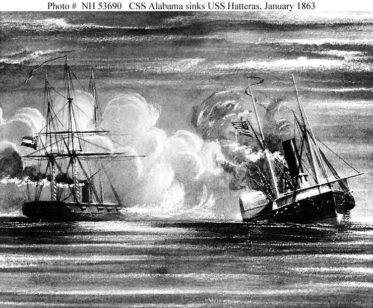 One of the rare ship-to-ship duels of the Civil War occurred off the coast of Galveston, Texas on this date of January 11, 1863. Galveston had at this time been recaptured by the South from Federal control, so the U.S.S. Hatteras was part of a fleet on blockade duty. Coming out to investigate a ship off the coast, the crew was certainly shocked to run into the Confederate raider C.S.S. Alabama. In a short nighttime duel, the superior guns of the Alabama made rather quick work of the Hatteras.